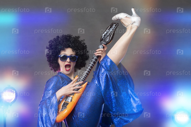 Девушка позирует в черном парике с игрушечной гитарой, изображая рок-исполнителя