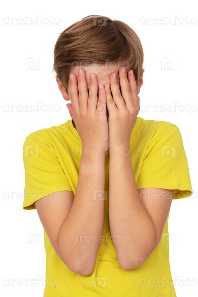 Подросток в желтой футболке прикрыл лицо руками