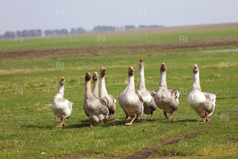 Стадо гусей проходит через поле. ноги выстроены в ряд, одни стоят, другие ходят. сцена мирная и спокойная, гусы движутся вместе в группе