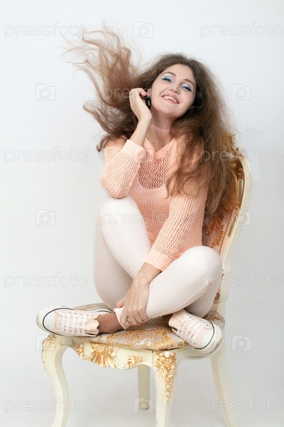 Счастливая молодая женщина, сидящая в украшенном кресле с длинными волосами, застрявшими посреди движения