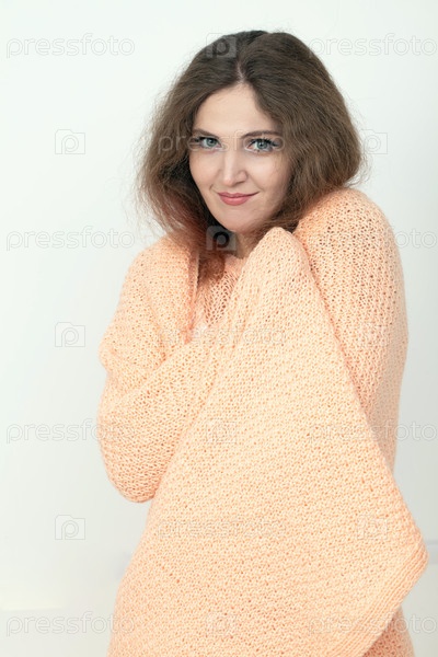 Молодая женщина мягко улыбается, окутанная в мягкий вязаный свитер персикового цвета