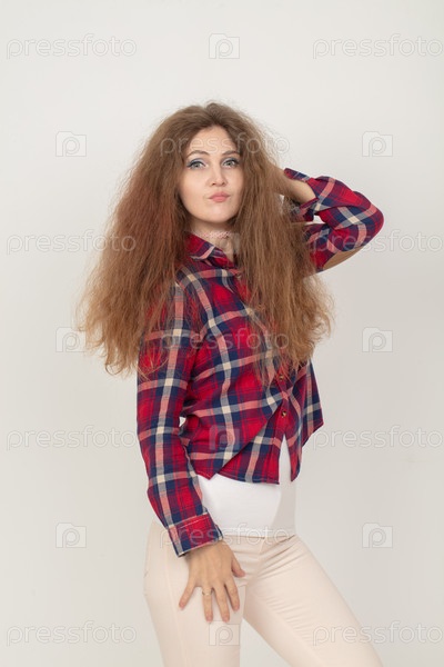 Женщина с длинными волосами, одетая в красно-белую квадратную рубашку.Позирует на фото и держит руку за подбородок