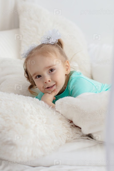 Маленькая девочка в зеленой рубашке на белых подушках