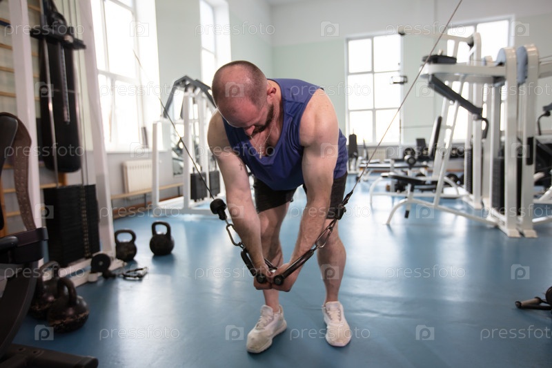 Мужчина-бодибилдер тренируется в тренажерном зале, силовая подготовка на канатной дороге