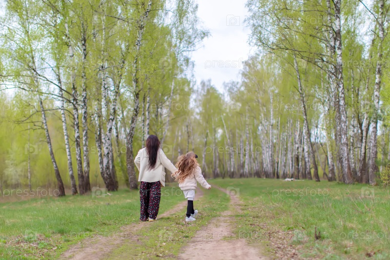 Мама и дочь гуляют по березовой роще спиной к камере
