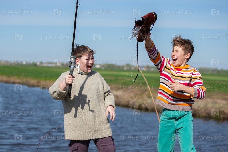 Два друга мальчика зацепили старую рыболовную удочку для обуви и посмеялись