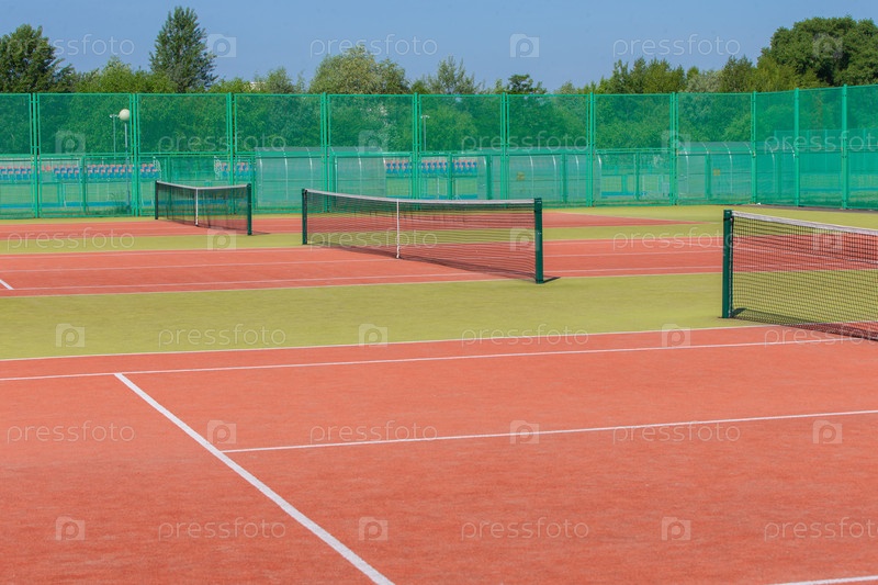 Теннисный корт пустой с сеткой и зеленым забором