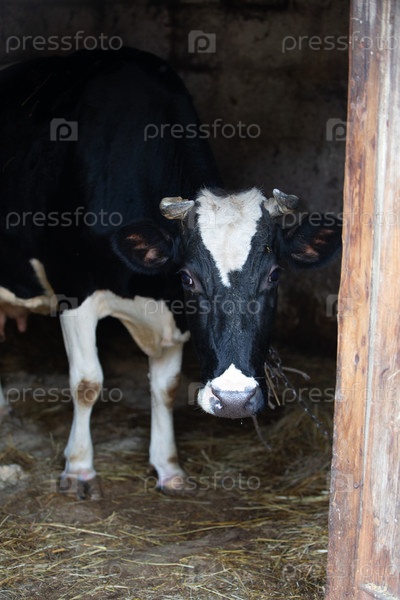 В амбаре стоит корова с рогами, у которой на голове белое пятно