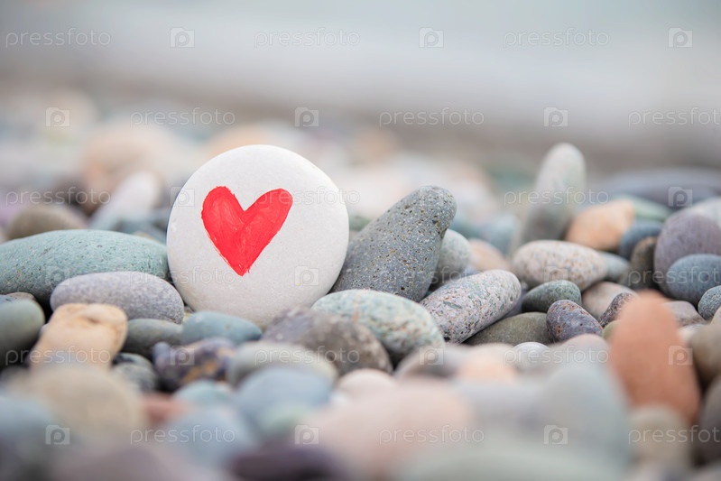 Белый камень с окрашенным красным сердцем на фоне серого морского гальки