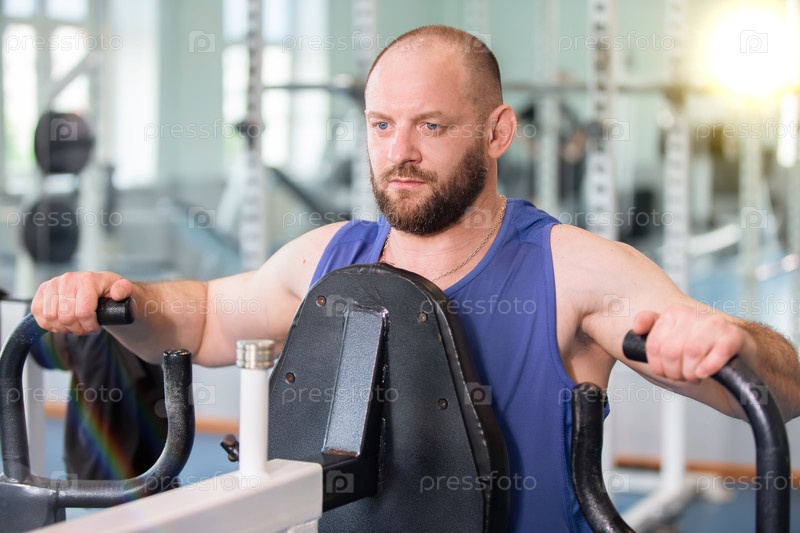 Мужчина в синем томе пользуется автомобилем на тренажерном зале. он выглядит сосредоточенным и сконцентрированным, когда работает