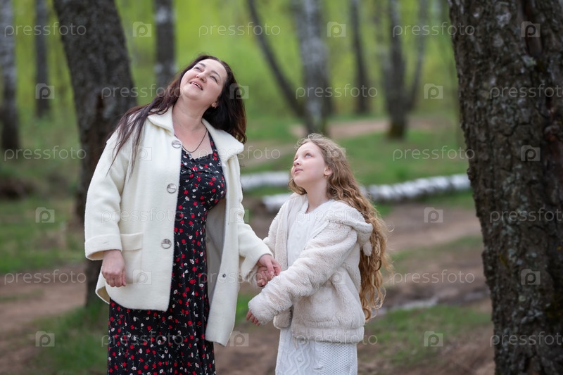 Мама и дочь гуляют в березовой роще