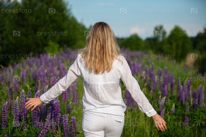 Женщина идет спиной к камере через поле фиолетовых люпинских цветов.Она одета в белое и наслаждается красотой цветков