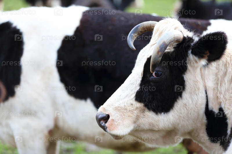 Корова с белой мордой и черным телом стоит на поле.Корова смотрит в камеру