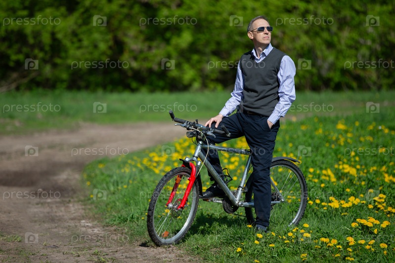 Привлекательный пожилой мужчина в костюме катается на велосипеде на весеннем лугу