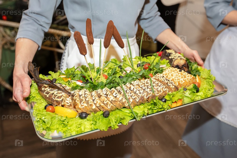 Руки официанта держат на подносе плюшевую щуку, украшенную листьями салата