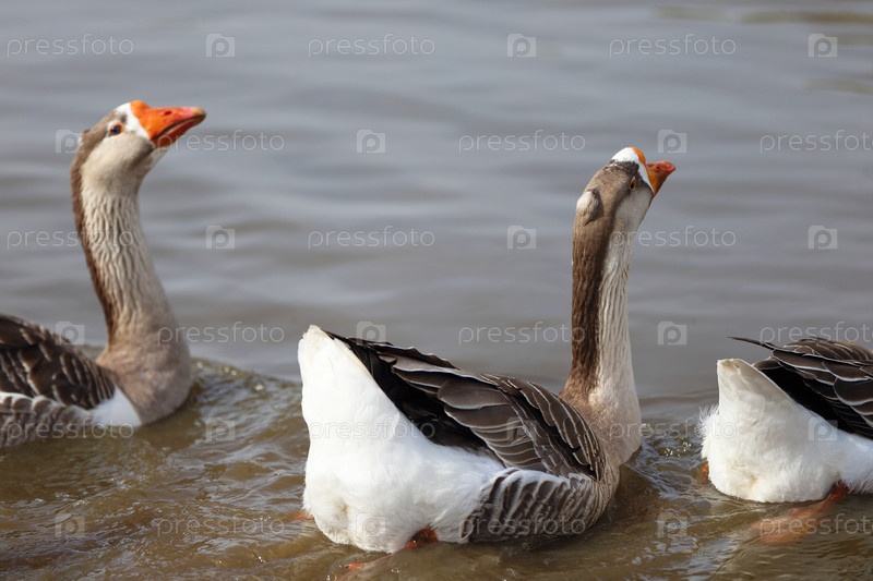 Оранжевый клювник купается в искусственном пруду с мутной водой летом на ферме