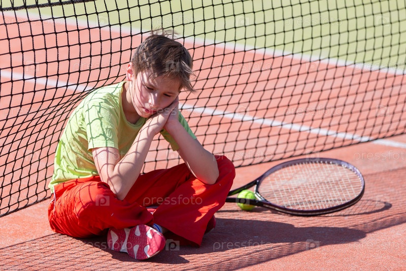 Мальчик проиграл соревнование по теннису.Ребенок сидит в сетке с ракетой.Психология спорта в детстве