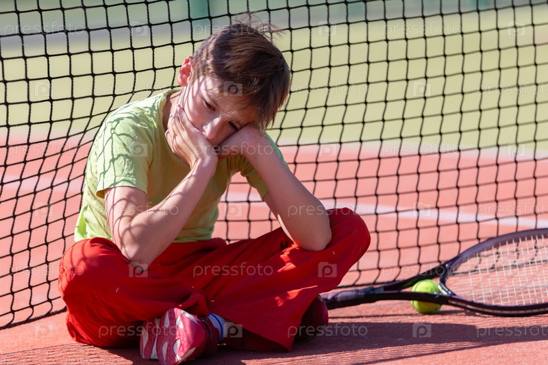Мальчик проиграл соревнование по теннису.Ребенок сидит в сетке с ракетой.Психология спорта в детстве