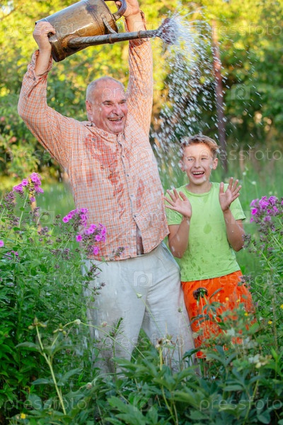 Дедушка поливает цветы водой, а внук смотрит и смеется