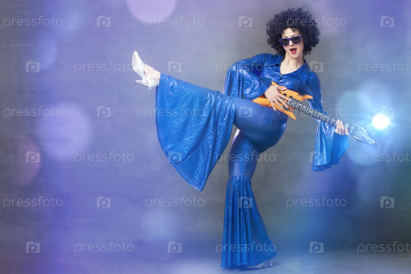 Забавная девушка позирует в черном парике с игрушечной гитарой на сером фоне