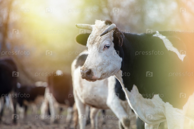 Корова с белым лицом и черно-белым телом стоит на поле вместе с другими коровами.Корова, кажется, смотрит в камеру, возможно, любопытно или осторожно.Концепция спокойствия и мира