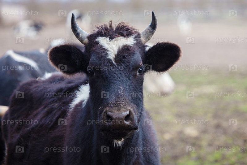 Близкий план черно-белого быка с белым пятном на лице. он смотрит в камеру