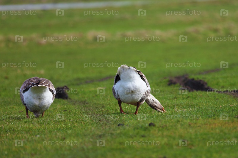 Две гуси пасутся на зеленой лужайке.Они едят траву на ферме