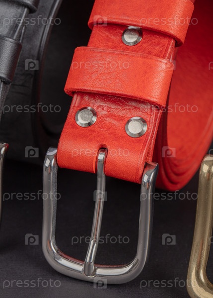 Кожаные пояса с металлическими запорами на сером фоне