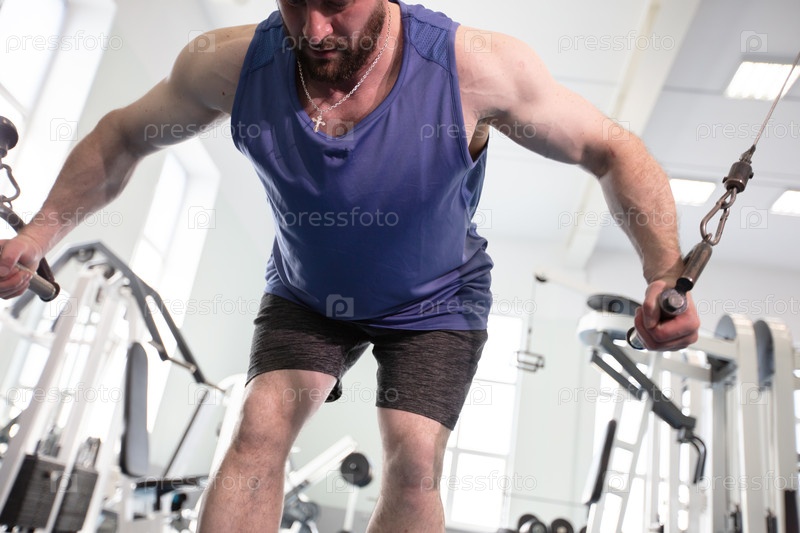 Мужчина-бодибилдер тренируется в тренажерном зале, силовая подготовка на канатной дороге