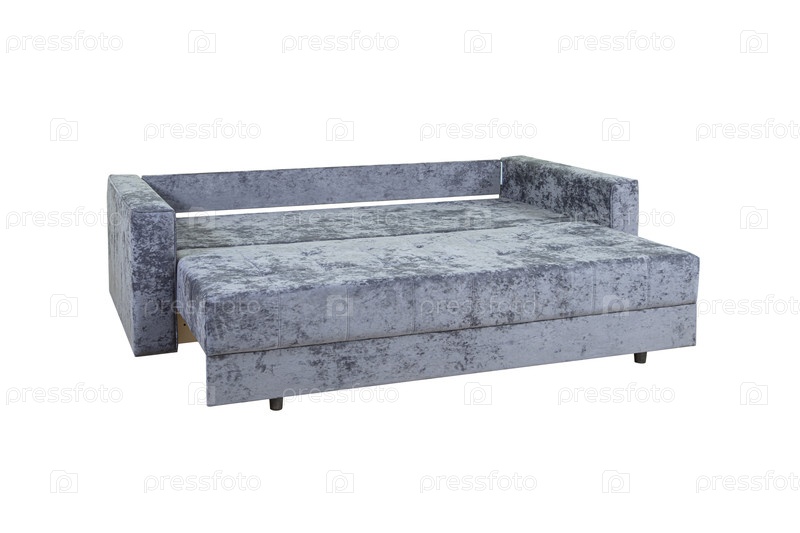 Серый развернутый диван с подушками из волоконной ткани, изолированный на белом фоне