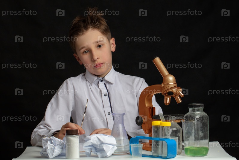 Парень-исследователь с микроскопом проводит эксперименты в лаборатории. Студент изучает биологию и химию. Наука и образование