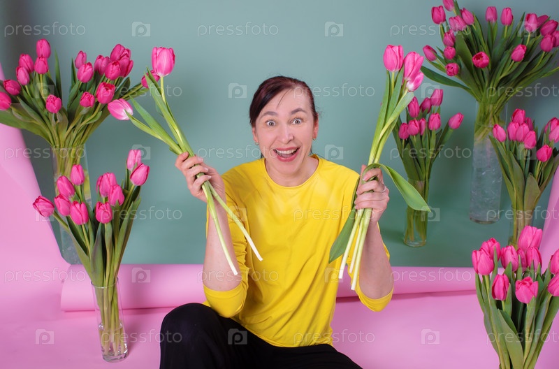 Счастливая женщина средних лет с букетом тюльпанов счастлива и улыбается на розово-зеленом фоне