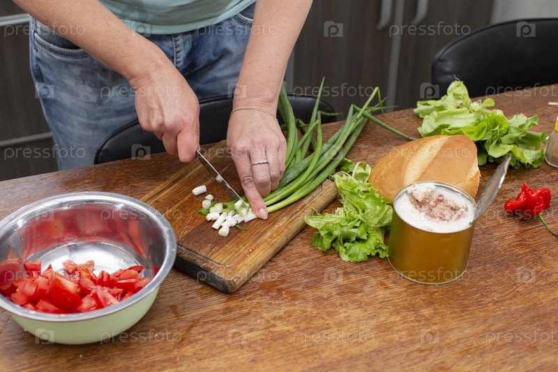 Нарежьте зеленый лук и помидоры, поместите их в чашу.Сделайте салат