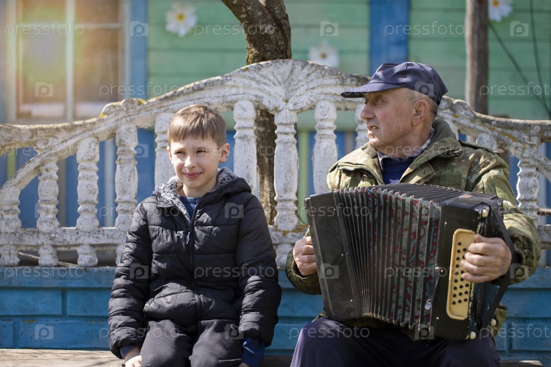 Русский дедушка играет на гармонике внуку возле деревенского дома