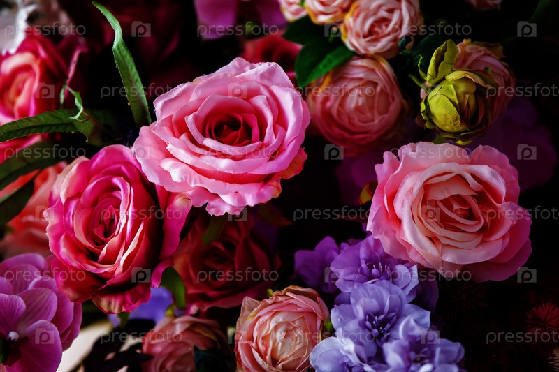 Цветочный многоцветный фон, розовые букеты вблизи