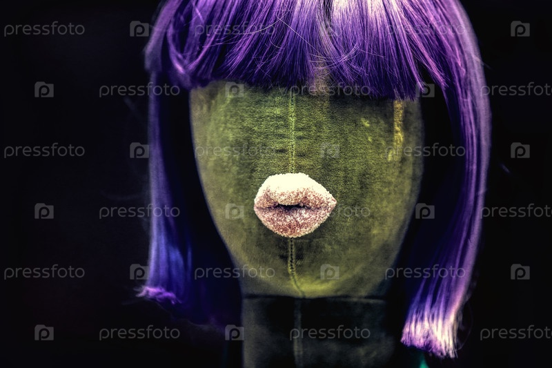 Творческое лицо женского манекена в фиолетовом парике и выступающих тряпичных губах