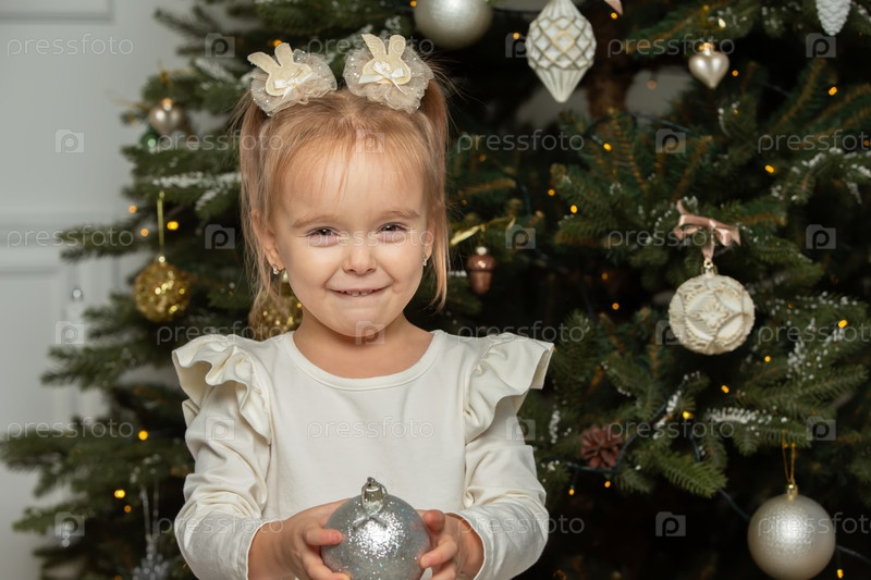 Забавная девочка с рождественским мячом перед елкой