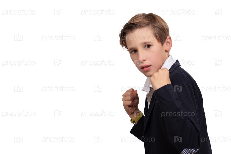 Портрет мальчика, который защищает себя и готов сражаться против белого фона