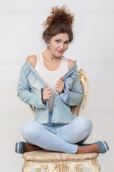 Красивая женщина в джинсовом костюме позирует на стуле на сером фоне