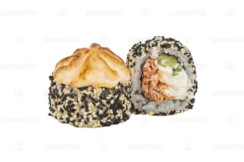 Суши на белом фоне с сыром из Филадельфии и тунцом в сусамовых крошках