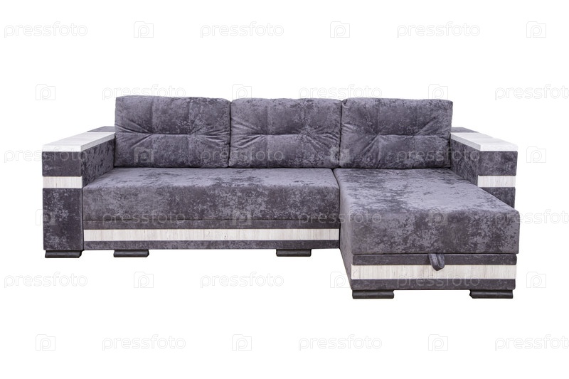 Серый угловой диван с танкетом, изолированный на белом фоне. мягкая мебель