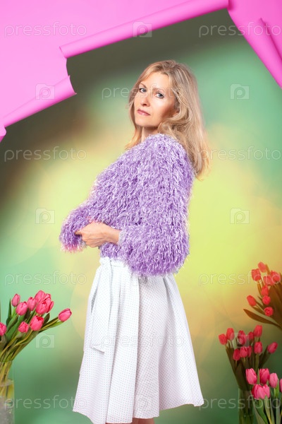 Портрет красивой женщины средних лет, выходящей из разорванного бумажного розового фона в окружении тюльпанов и волшебного желтого света