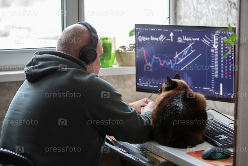 Трейдер-мужчина сидит дома за компьютером, отслеживает график на фондовой бирже, занимается торговлей и торговле акциями
