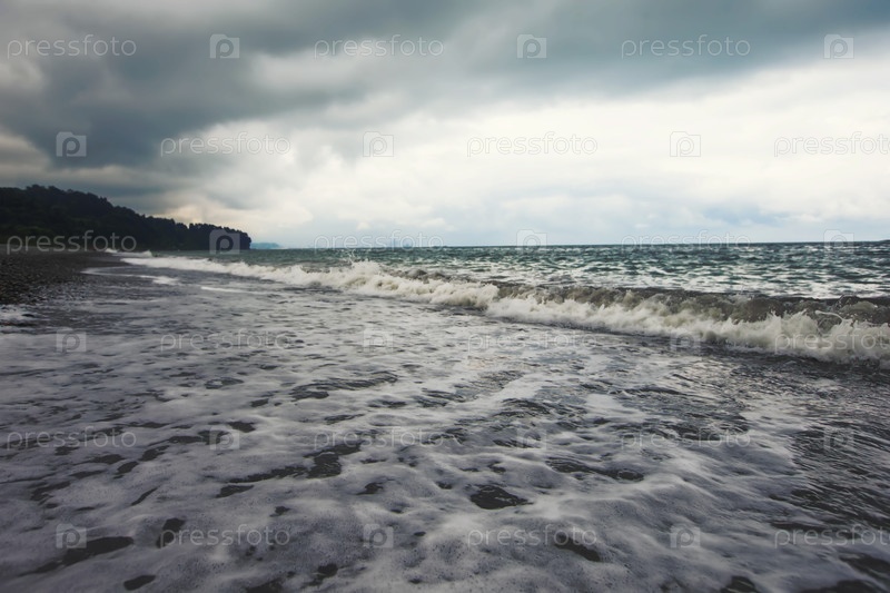 Морской пейзаж с галечным пляжем и распространяющимися волнами Черного моря