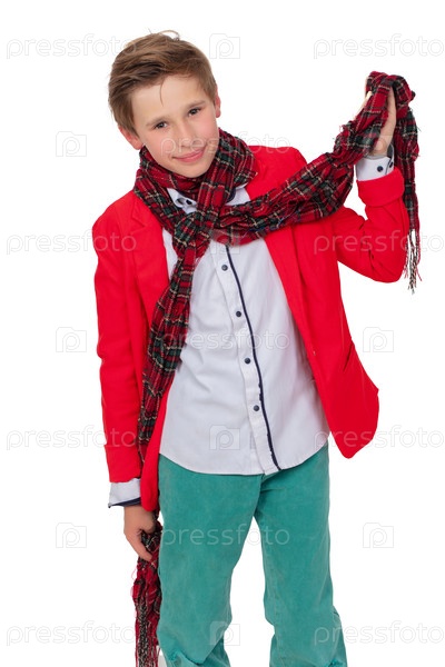 Портрет улыбающегося мальчика в красной куртке и шаре. модный подросток в элегантной одежде