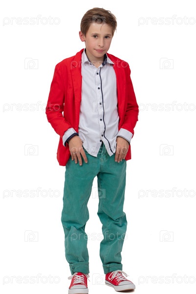 Красивый подросток в красной куртке, белой рубашке и зеленых брюках улыбается и смотрит в камеру