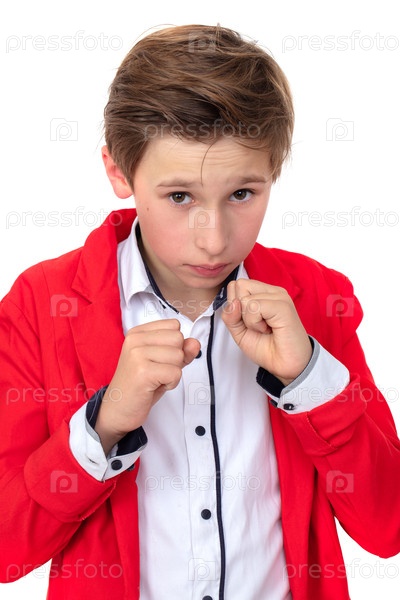Красивый мальчик-подросток в красной куртке и белой рубашке стоит в позе бокса и готов дать отпор