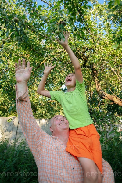 Мужчина и мальчик собирают яблоки с дерева