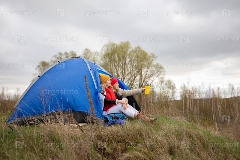 Активная пожилая пара отдыхает в палатке на фоне осеннего природного пейзажа