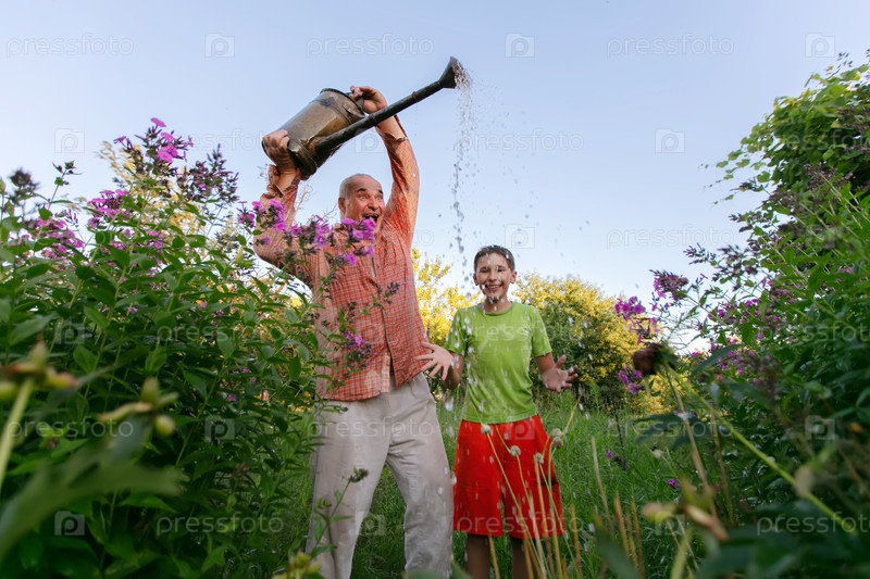 Дедушка и внук поливали цветы из оросительной кастрюли в саду